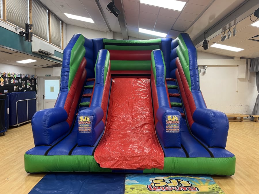 Designed and manufactured in accordance with the UK / EU inflatable safety standard (BS EN14960), you can rest assured that this inflatable is safe to use. The unit has been built with bright colours used throughout including red, blue and green material. There are two sets of steps (either slide of the unit) for users to access the 6ft platform slide so this slide stands at 6ft tall where the user sits when beginning to slide.