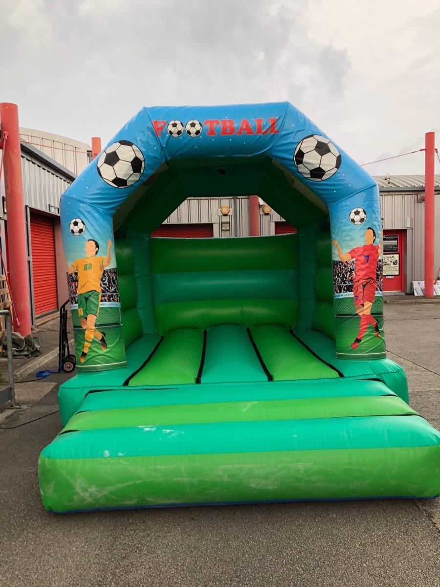 This bouncy castle has added velcro artwork on the front pillars and top beam of football related artwork.