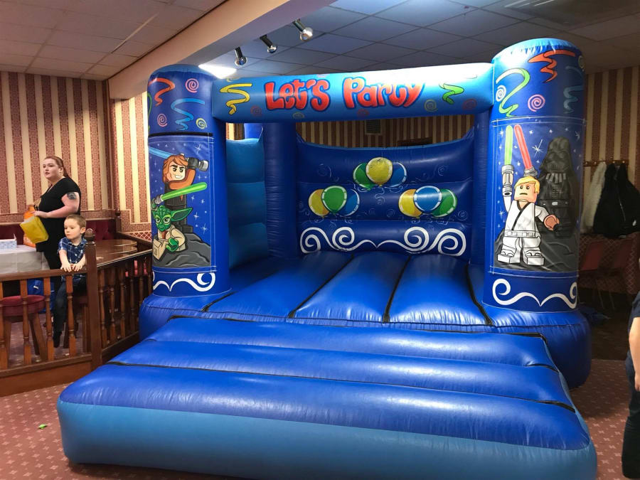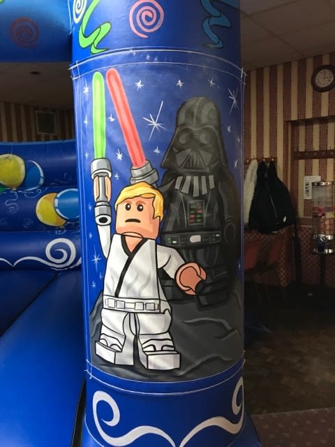 The bouncy castle is decorated on the two front pillars with superb, hand painted artwork of Lego Star Wars characters and the top beam and back wall is decorated with fantastic party artwork including the 'Let's Party' slogan.