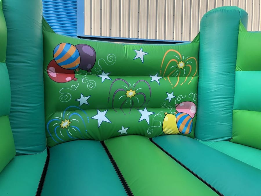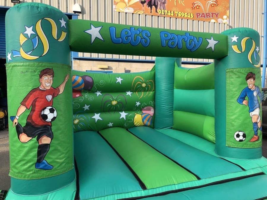 This particular bouncy castle is manufactured right here in the UK and conforms with all of the inflatable safety standards set out in BS EN 14960:2013. The back wall of the inflatable features general party hand painted artwork of fireworks and the like with the let's party slogan across the top beam of the bouncy castle and more streamers artwork on the side pillars. Also on the side pillars of the bouncy castle is two footballers, one in a red kit and one in a blue kit. Perfect for supporters of football teams in the Liverpool and Manchester area or surrounding area.