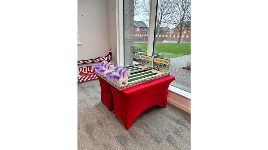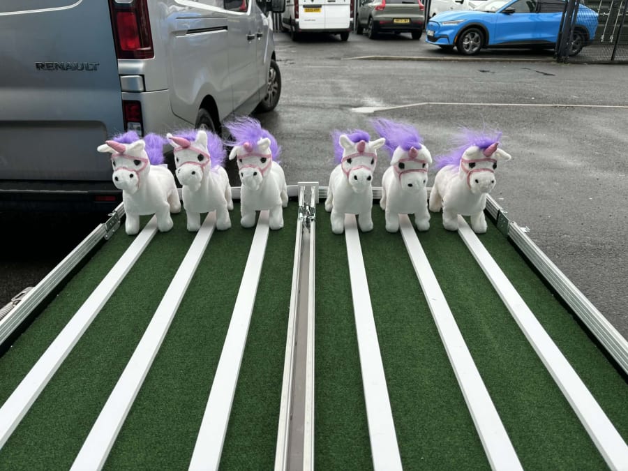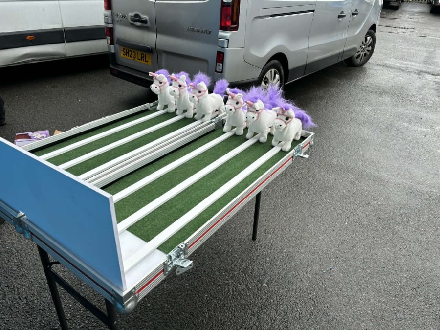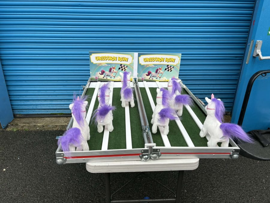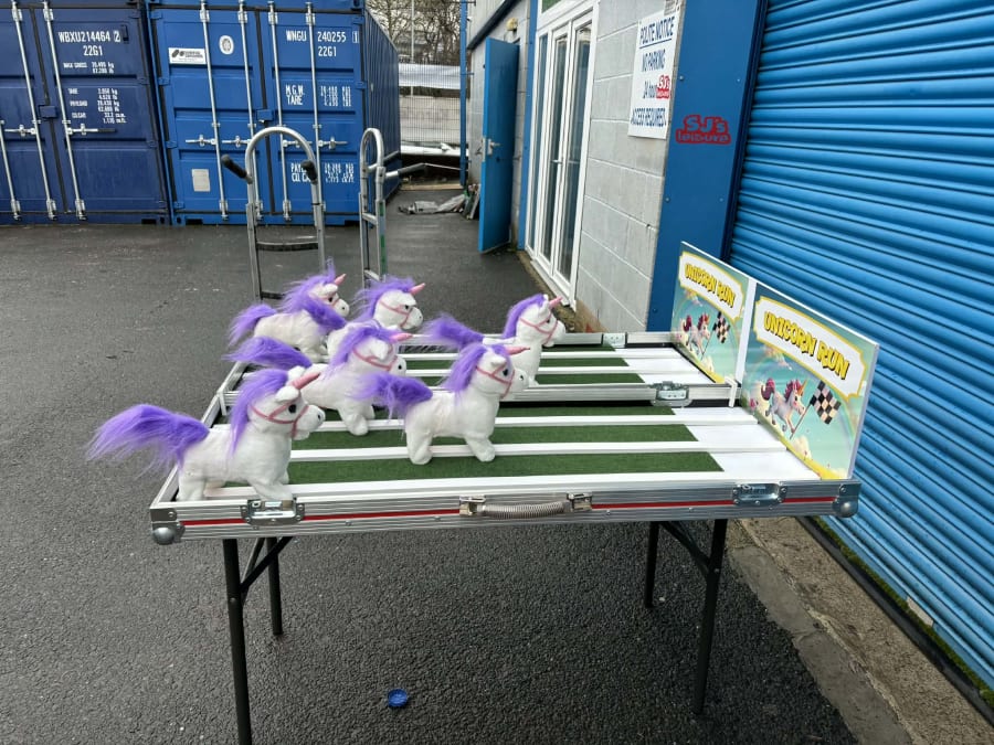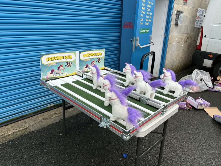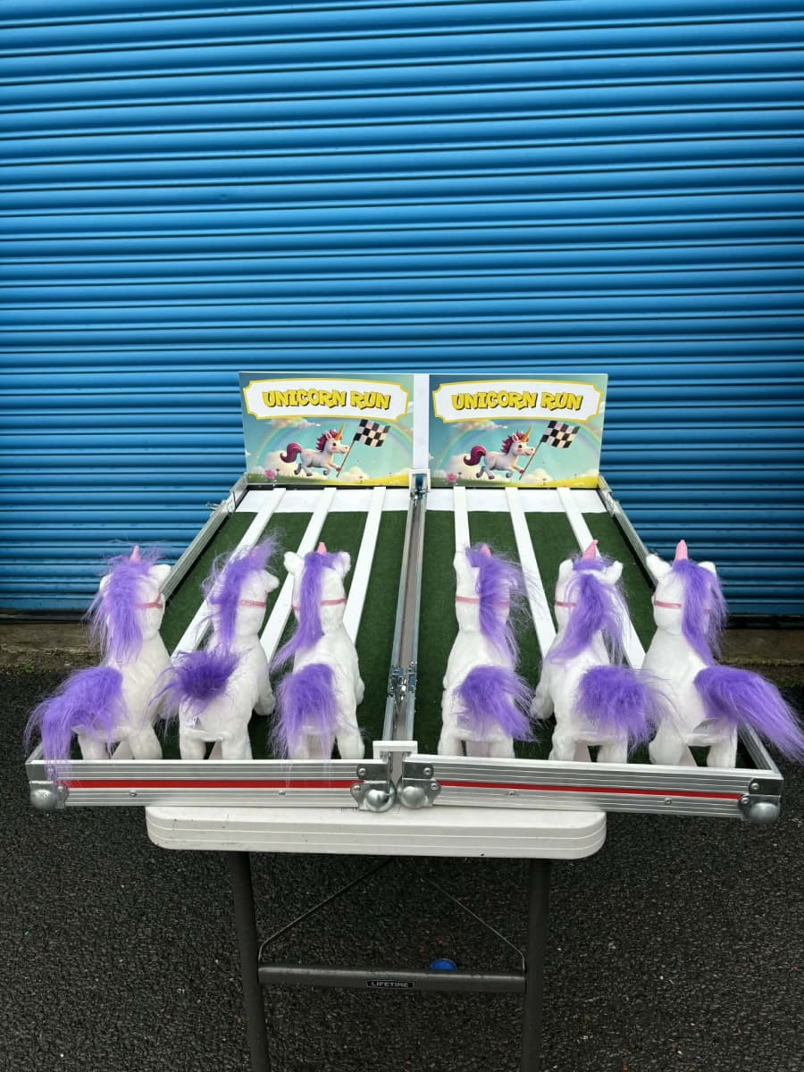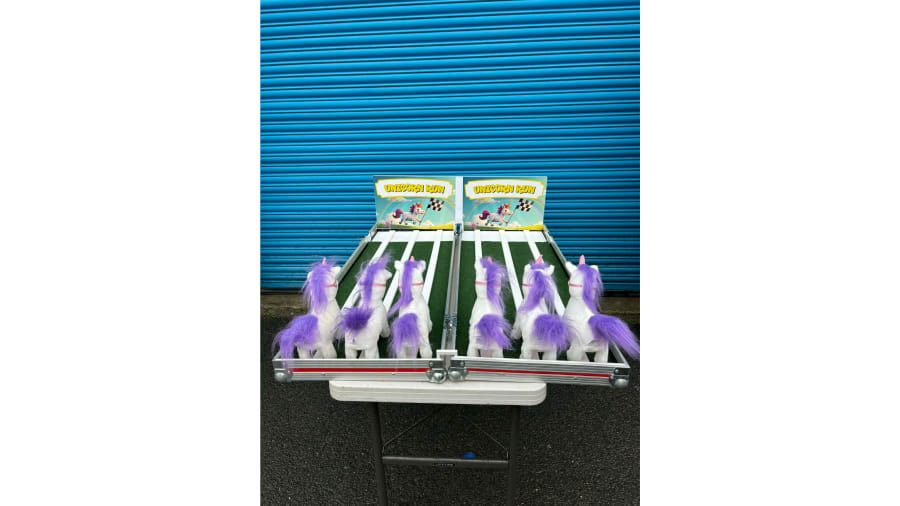 Included when hiring this product is a wooden track which is supported on a table complete with carnival style table skirt. The aim of the game is for each user to pick a toy unicorn (which are all battery powered) and then wind up the toy unicorn and place it on the track at the same time as their opponents. The toy unicorns will then walk and waddle their way down the track. The first toy unicorn to reach the end of the track is the winner and that user is then the winner.