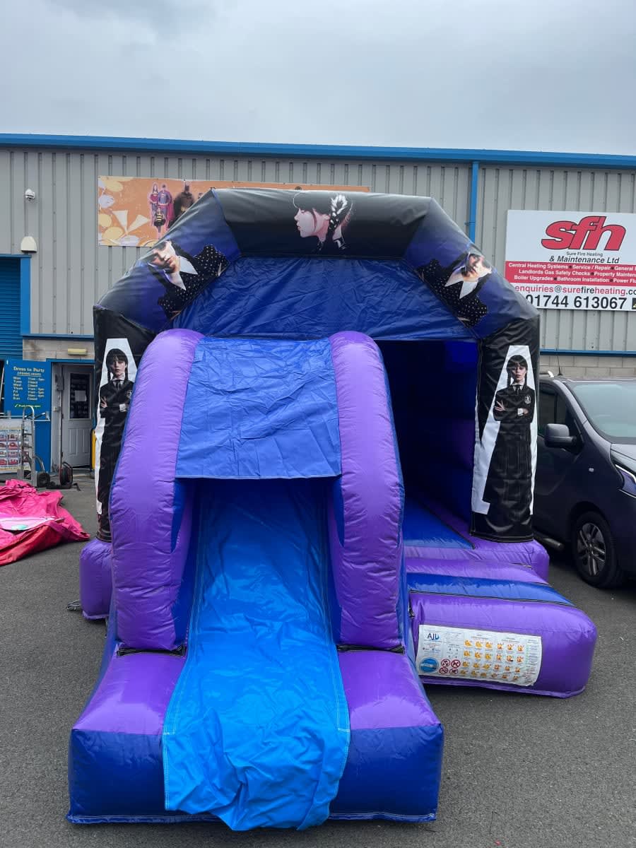 Brand new to our range of inflatable and fun products for Summer 2023 is this fantastic Wednesday bouncy castle and front slide combo.