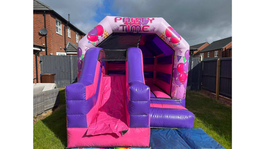 This gorgeous pink & purple partytime front slide combo is perfect for a variety of events including birthday parties, christenings, wedding receptions, school fun days and much more.