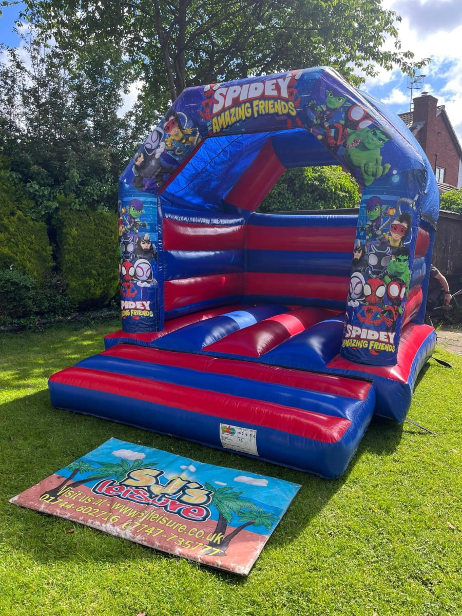Spidey themed bouncy castle hire in Warrington, St Helens, Widnes, Wigan, Ormskirk, Liverpool and other North West postcodes