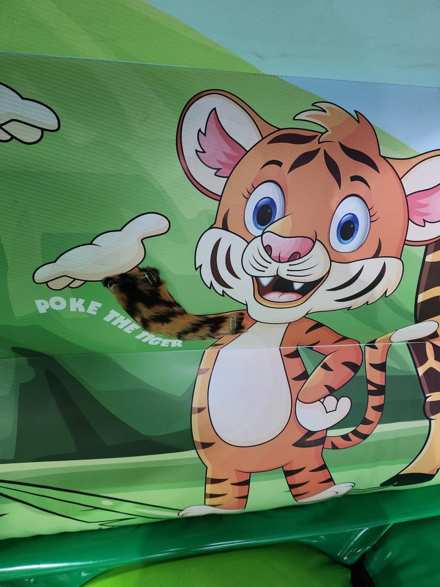 The colour scheme of the bouncy castle is complimentary to the theme with two tone green material used throughout. The back wall of the unit features more awesome artwork and sensory components which children love! Check out the product photos for more information of these sensory elements.