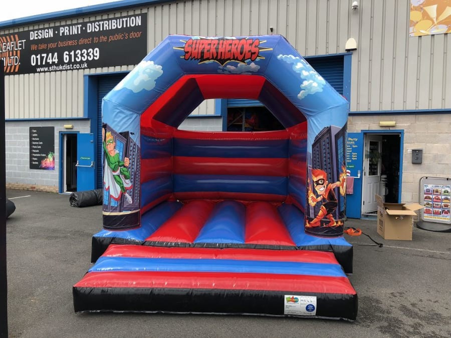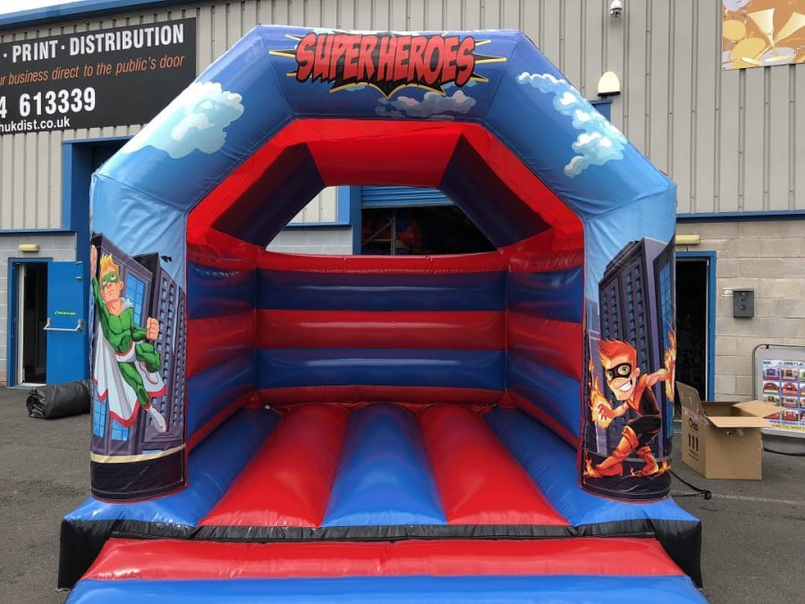 Digitally printed artwork features on the front pillars of the bouncy castle and across the top beam. The artwork features generic superhero characters including a green superhero and a red superhero with a 'Superheroes' slogan blazen across the top beam of the bouncy castle.