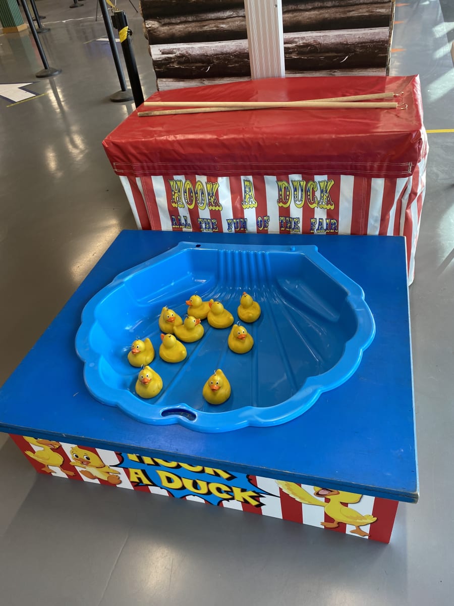 This traditional hook-a-duck side stall is ideal for a fun event and features a wonderful red and white candy stripe design with cartoon mini yellow ducks.