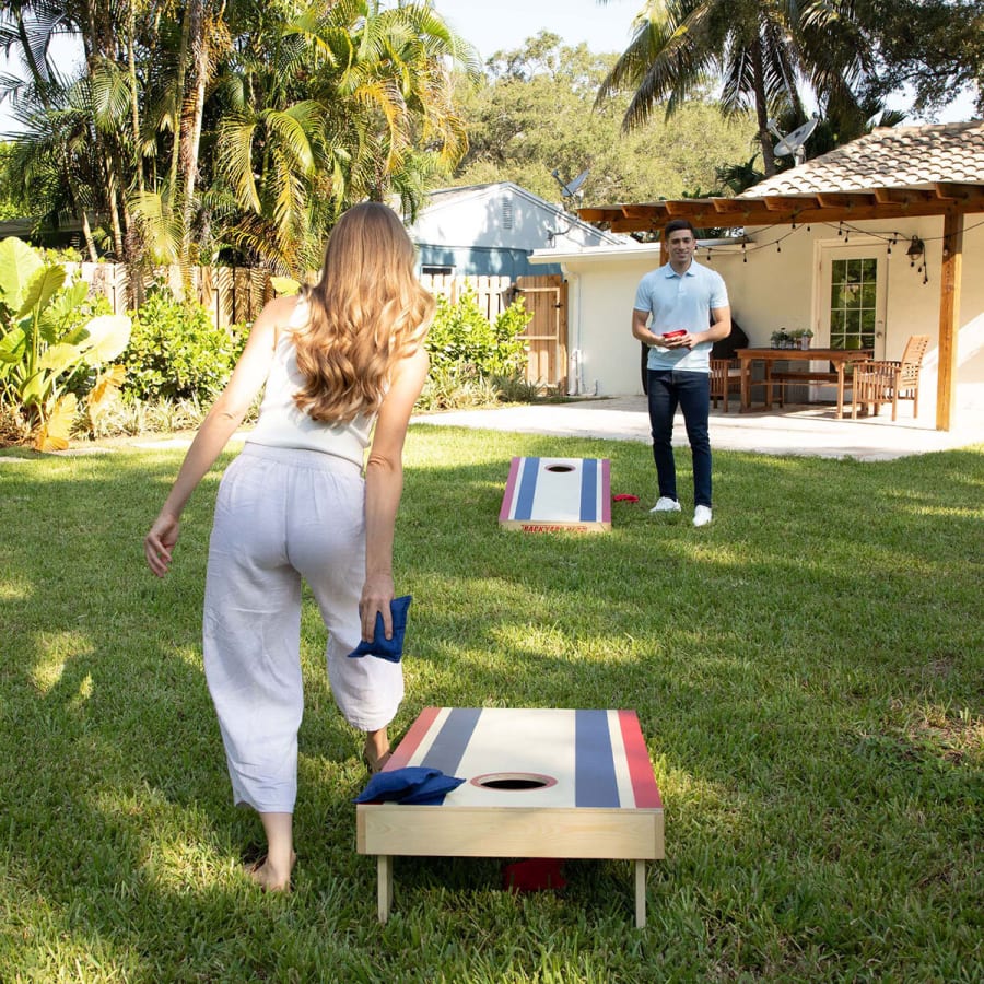 The Backyard Hero Cornhole Set features ACA regulated professional tournament-sized boards which are heavy-duty, fun to play, and made to withstand countless games. For increased strength and durability, it is made from premium hand-crafted New Zealand pine wood in the frame and legs. The playfield or surface area comprises thick multilayered plywood coated with a protective lacquered finish. The professional-grade, all-weather "stick and slide" bags are double-stitched and burst-resistant.