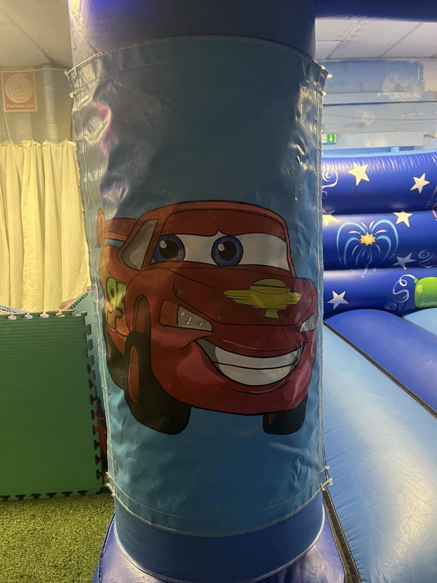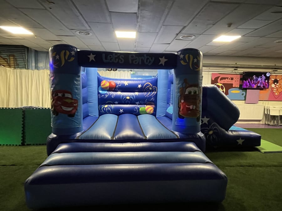 An indoor suitable bouncy castle and slide combo suitable for venues with low ceiling heights (under 10ft tall). Designed and manufactured in accordance with UK and European inflatable safety standards (BS EN1960), this unit is a Cars themed inflatable bouncy castle with Lightning McQueen and Mater illustrated on the front-facing towers.