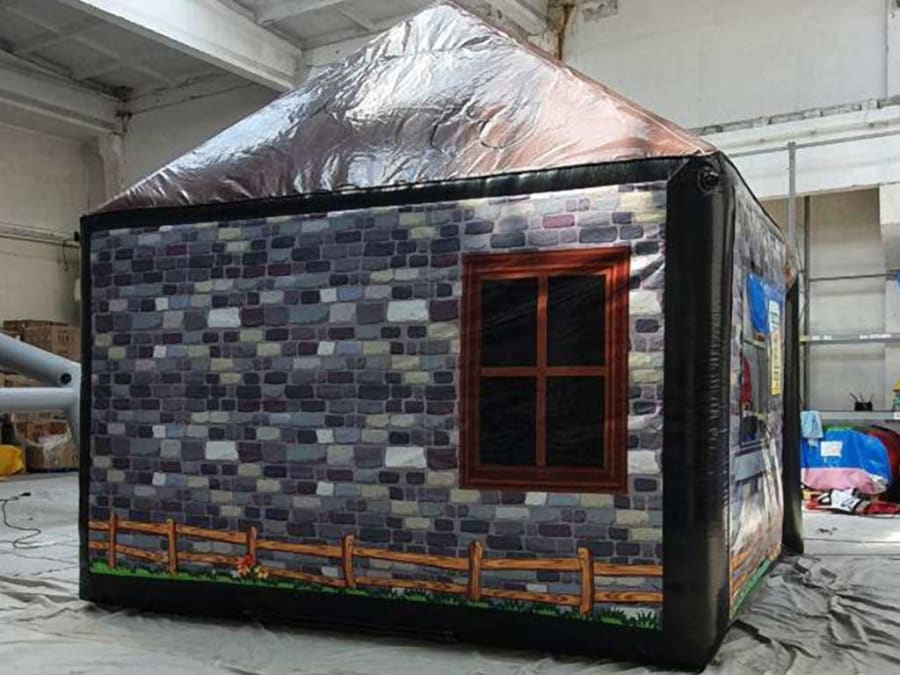 The floor space measures just over 15ft wide by 15ft long and it stands at it's tallest point at just under 15ft tall. Please check the 'size' tab for all relevant size information for this product. The inflatable is decorated with digitally printed artwork across the external 'skin' including a traditional pub door and lantern, a wanted poster, TNT barrels, wooden fencing and a brick pub pattern effect. There is also mesh windows on the inflatable so the outside can be seen.