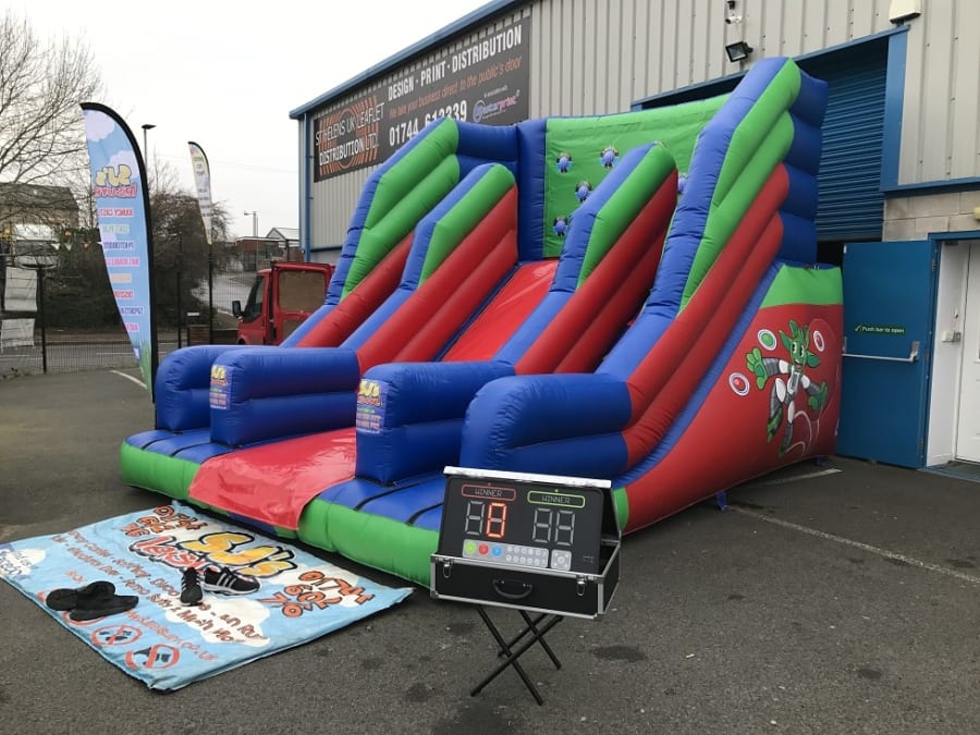 The game is a really exciting and adrenaline filled activity. Users start at the bottom of the inflatable, race up the slide, tap out their chosen colour, either red or green, they then slide down the six foot platform. Once they reach the bottom, they repeat by racing back up the steps. At the end of the allocated time, the user with the highest points score wins.