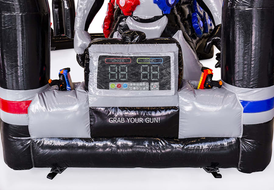 Users are each given a Nerf gun with loaded ammo and enter the inflatable course looking to gain the highest score possible. Each user will have selected a team / colour. Red team and green team. Users look to 'knock out' as many lights of their chosen team colour by shooting the Nerf bullets from the Nerf gun. For example, the red team will shoot at as many red lights as they can find.