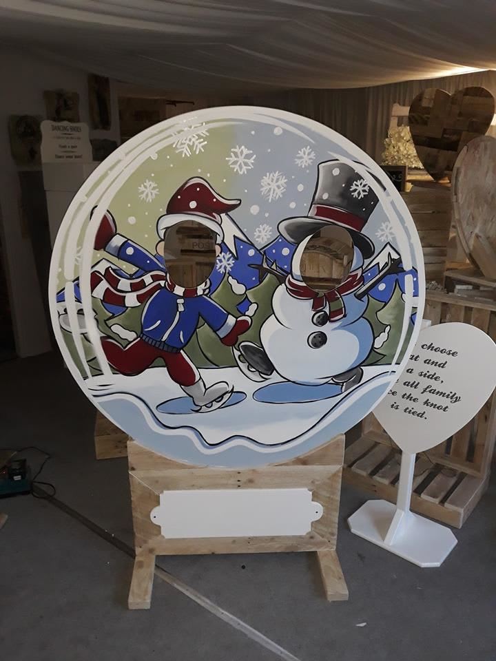 This is truly a piece of art from our fantastic carpenter who manufactures all of our wooden hire products including LED signs and games. Finished beautifully with some magical hand painted artwork of a traditional snowman wearing top hat and scarf and a person skating in winter attire and Santa hat.