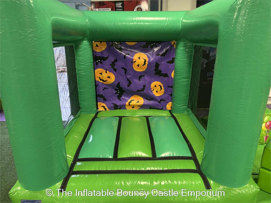 The bouncy castle itself is a mini indoor unit, specially designed for toddlers and built to the latest UK and European safety standards (BS EN14960). It comes in a bright green finish, with a Velcro back wall panel decorated in crisp, vivid Halloween artwork – a striking purple background covered in black bats and orange pumpkins.