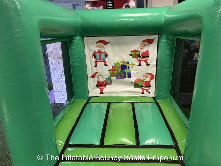 The mini bouncy castle is manufactured in bright green material and is fully compliant with UK and European inflatable safety standards (BS EN14960). To give it that festive touch, the Velcro back wall panel has been fitted with a crisp and colourful Christmas design. The artwork features four cheerful Santa Clauses in different poses, complete with rosy cheeks, big smiles and traditional presents. The centre of the design is decorated with beautifully wrapped gifts tied with large ribbon bows – the perfect backdrop for little ones to bounce in front of!